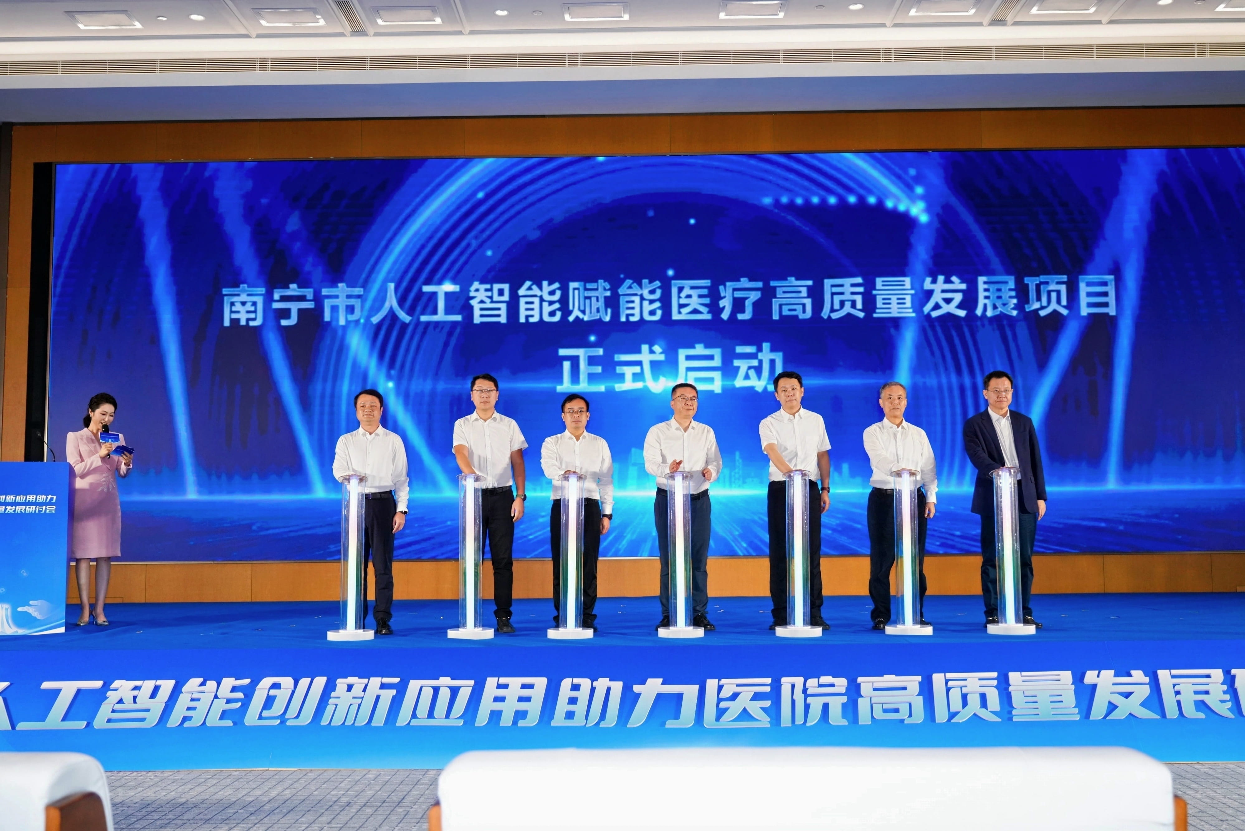 会上,南宁市市委常委、副市长张小强,自治区卫生健康委医政处处长吕向劼,南宁市卫生健康委员会党组书记、主任唐驰,南宁市第二人民医院党委副书记、院长梁艺,开云官方网页版董事长、总裁朱朝阳,华为广西政企副总经理翟晓奇,上海润达医疗科技股份有限公司总经理刘辉共同启动“南宁市医疗人工智能升级项目”,开启南宁市医疗事业迈向智能化新征程的重要里程碑。