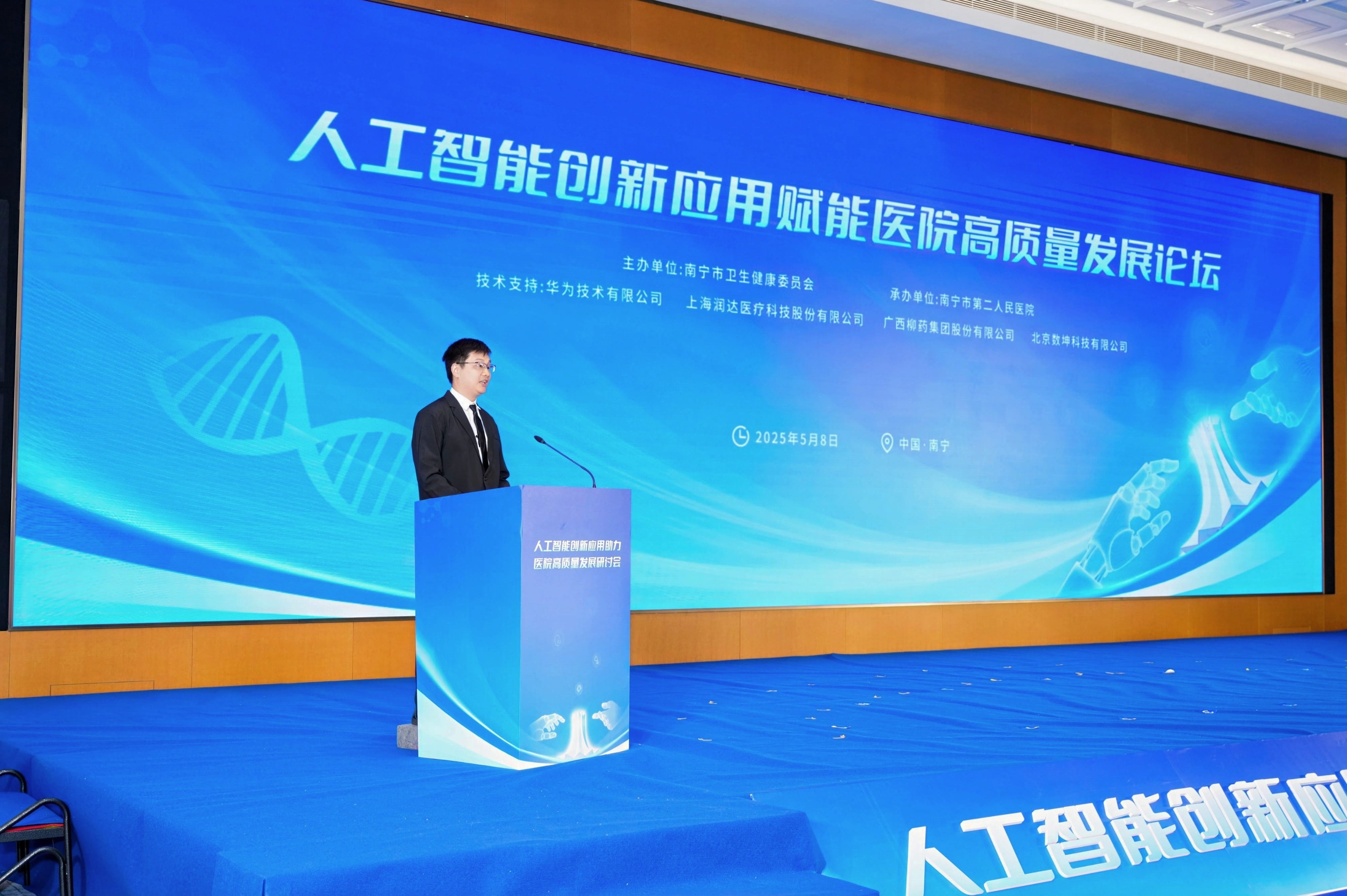 在简洁而隆重的“南宁市医疗人工智能升级项目”启动仪式后,主办方各专家围绕“人工智能创新应用助力医院高质量发展”分享了各自观点。南宁市第二人民医院院长梁艺进行了《智领未来・AI 赋能医疗新生态》的整体性思考分享,展示各方携手打造的AI应用标杆医院——南宁市第二人民医院AI场景应用情况。华为云医疗医药高级架构师刘一良进行了主题为《华为AI引擎驱动,加速医疗创新变革》的前瞻性主旨分享,用一个个典型案例展示了 “AI + 医疗”领域的深耕与探索,为南宁市医疗升级提供了强大的技术参考和启发。润达医疗智慧医疗事业部CTO张楠进行了《AI可信医疗——打造城市医疗一朵云》的主题分享,展示了润达医疗在构建区域医疗协同网络、实现医疗数据安全共享方面取得的成果丰硕,让 AI 技术在可信环境中发挥了更大价值。北京数坤科技解决方案顾问赵天添进行了《人工智能赋能智慧医防融合体系建设》的主旨分享,展现了AI “数字医生” 赋能筛诊治康管全流程,促进分级诊疗、医防融合的全面落地的生态全景。